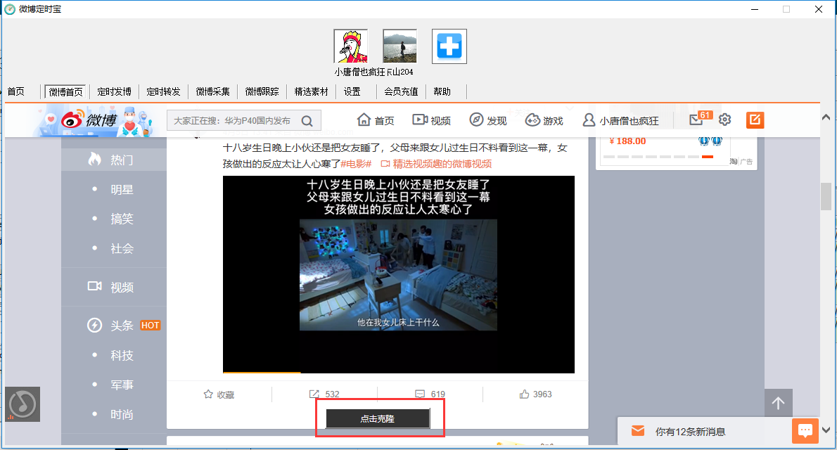 软件支持一键克隆任意微博,可分图片、视频等类型批量采集任意博主微博、也可搜索关键词批量采集微博、还可以跟踪任意博主并实时发布最新微博, 还可以根据分享链接一键上传抖音、快手、微视无水印视频。软件还有海量的视频素材库,软件无需注册微博扫码就可以直接用。