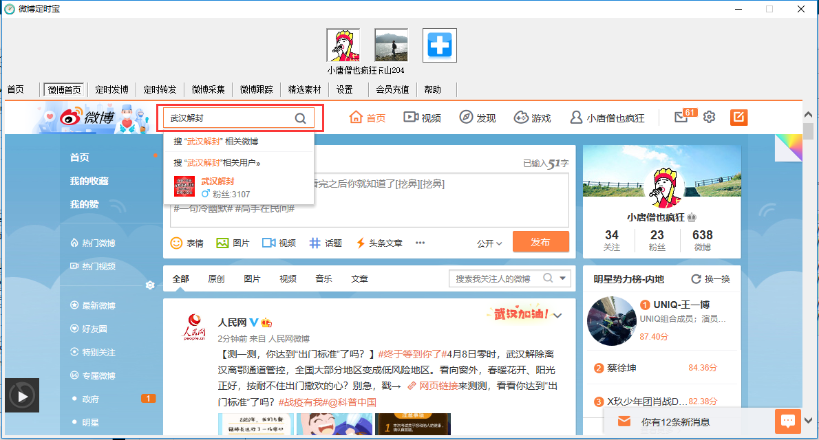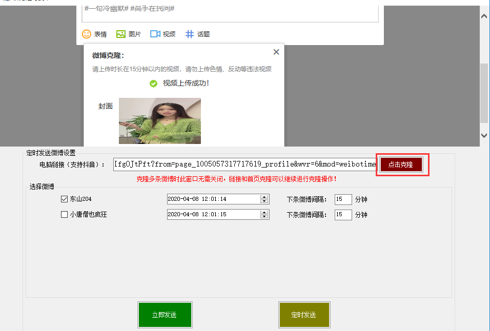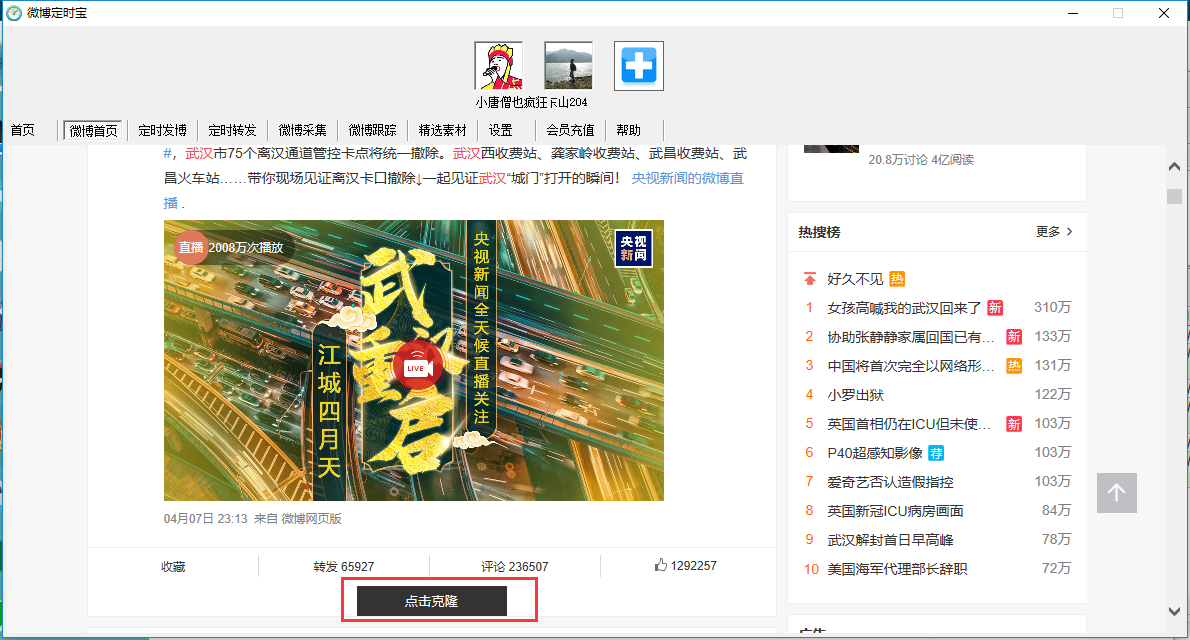 该界面可实现快速打开当前微博主页,同时可以实现微博的快速克隆(复制)并上传,也可在搜索框中搜索关键词查询结果进行克隆。
