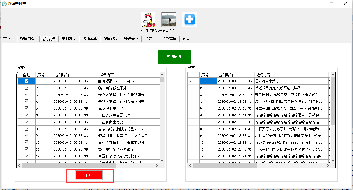 该界面主要用于查询已定时的微博,待发送及已发送的微博记录及执行结果,同时也可以删除待发送的定时微博。