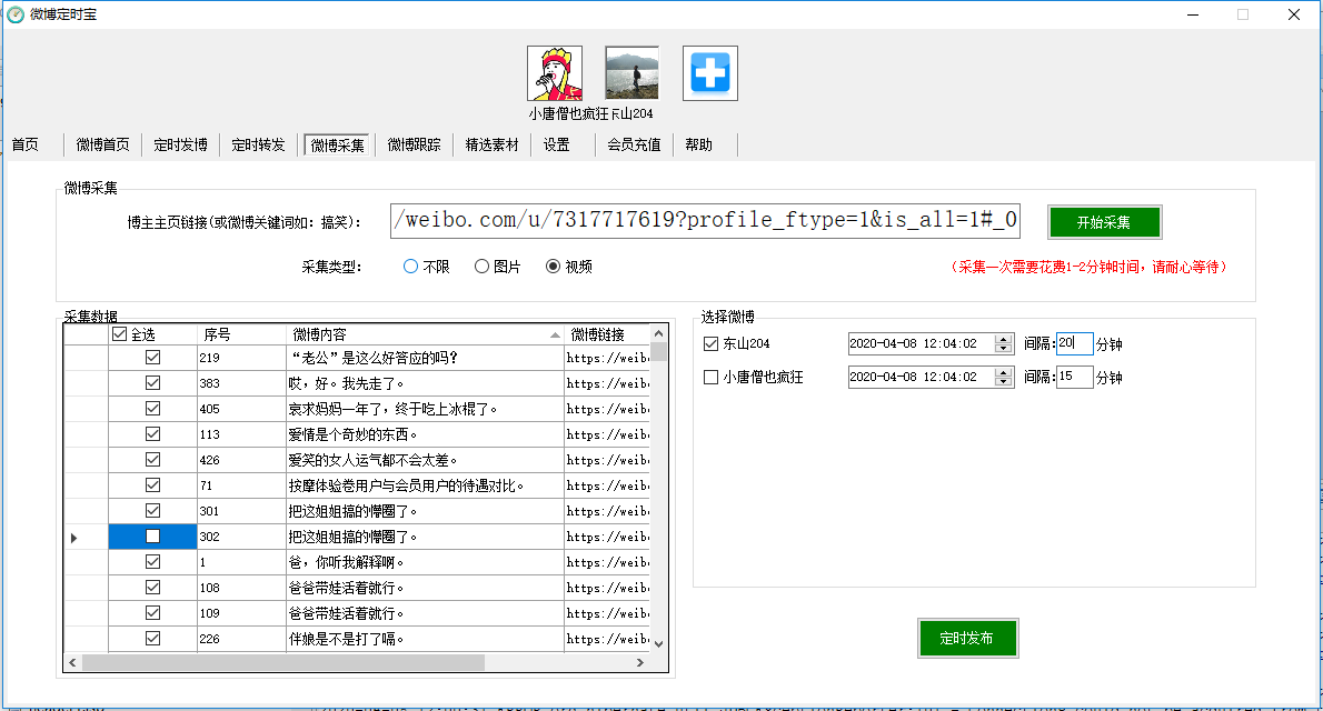 根据博主链接采集,一次只能采集一个博主。实现多个博主穿插发布,可根据设置定时时间实现。例:第一次采集某博主微博200条,间隔20分钟,开始时间设置为13:20,第二次采集另外某博主微博200条,也设置间隔20分钟,开始时间设置为是13:30,这样即可实现每10分钟发布一条微博,两博主的微博穿插发送。