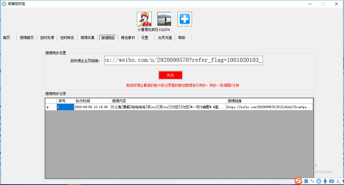 该界面主要用于跟踪某博主微博并实时发布对方发布的内容,填写该博主的微博主页链接后点击“开启”即可实现。